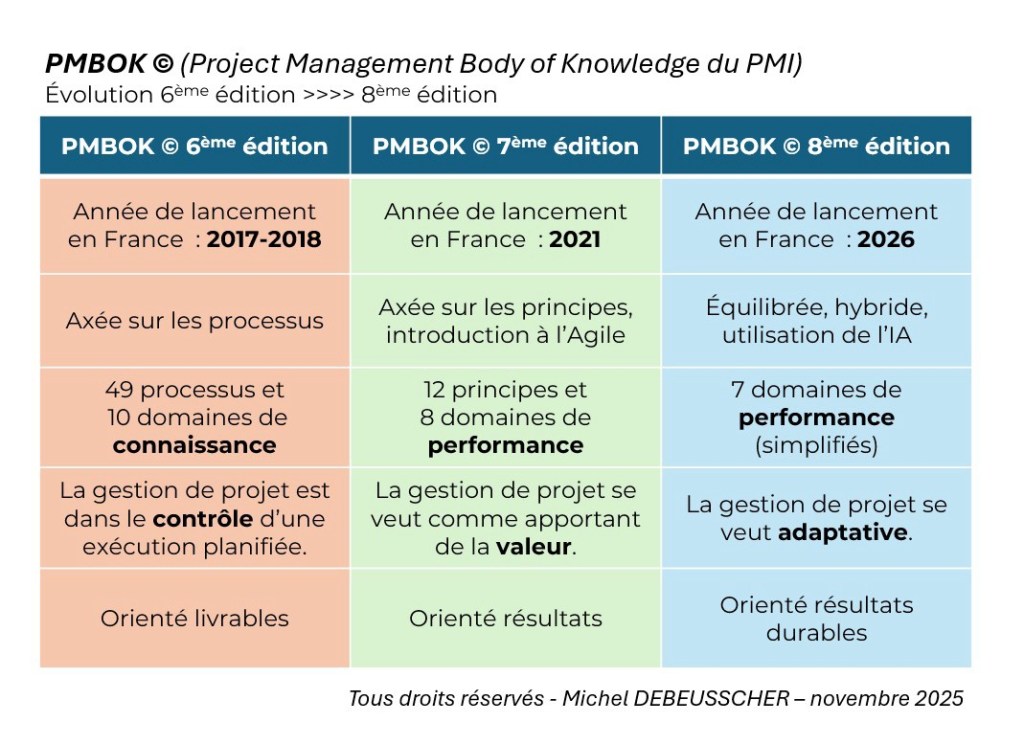 Les principales nouveautés annoncées pour la 8e édition du PMBOK sont de l’ordre de l’architecture du référentiel, du retour des processus, de l’intégration de l’IA/numérique et du renforcement de l’hybridation/durabilité.